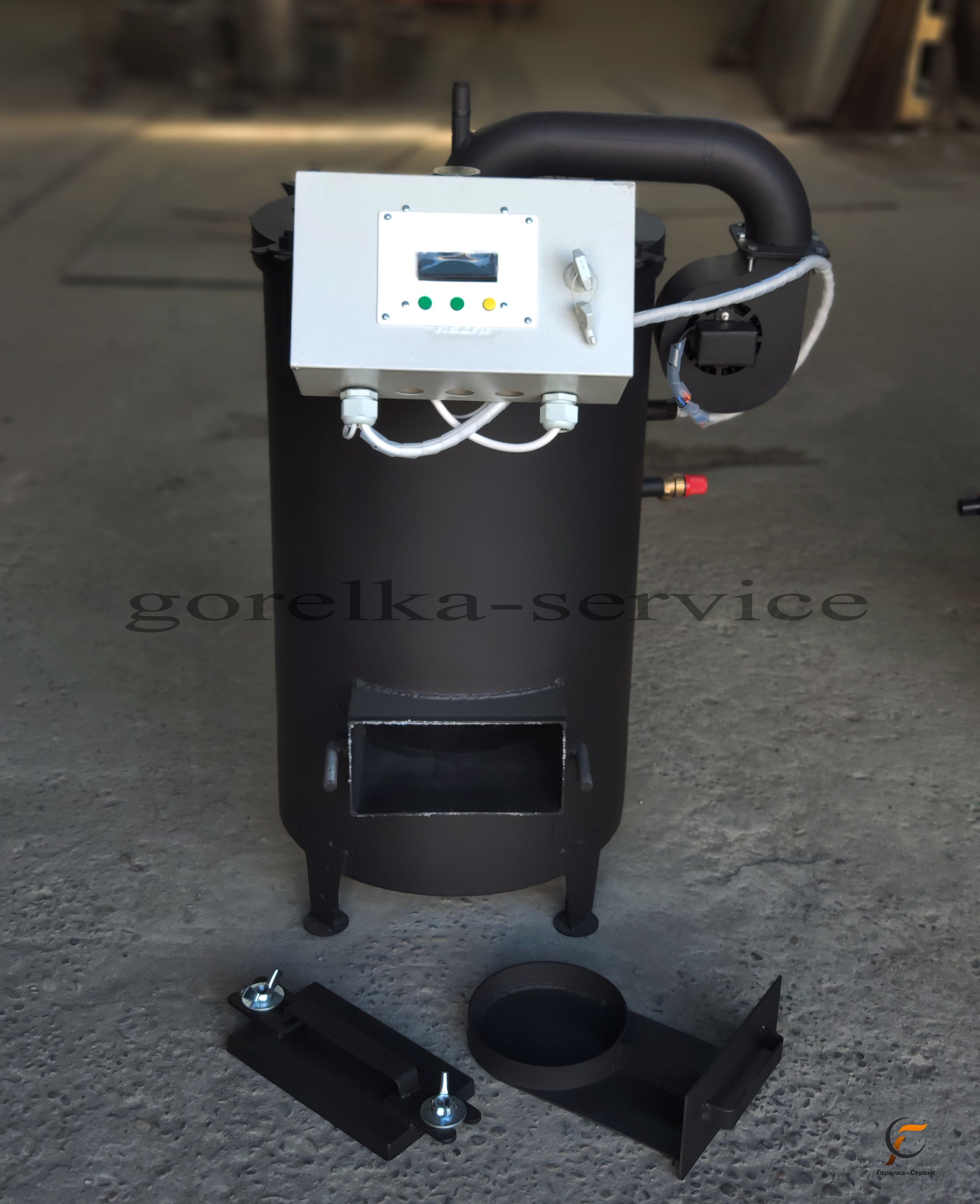 В комплектацию входит : теплообменник, блок управления, вентилятор надува, насос подачи масла, инструкция.